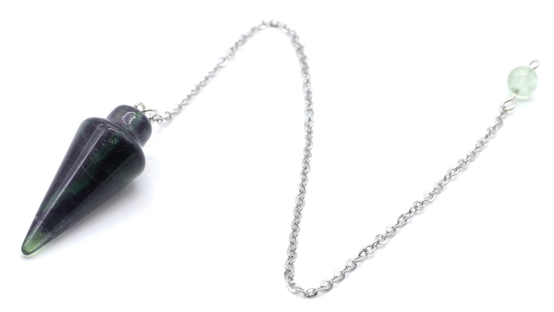 Petit pendule en pierre naturelle (fluorite), en forme de goutte, idéal pour la radiesthésie et la méditation.