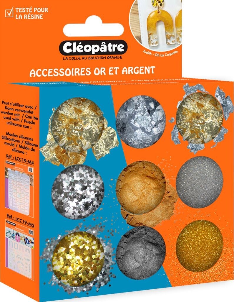CLEOPATRE – Kit Accessoires Résine – Paillettes, Poudres de mica et Feuilles - Or/Argent pour Créations en Résine UV et Epoxy - 9 Pots