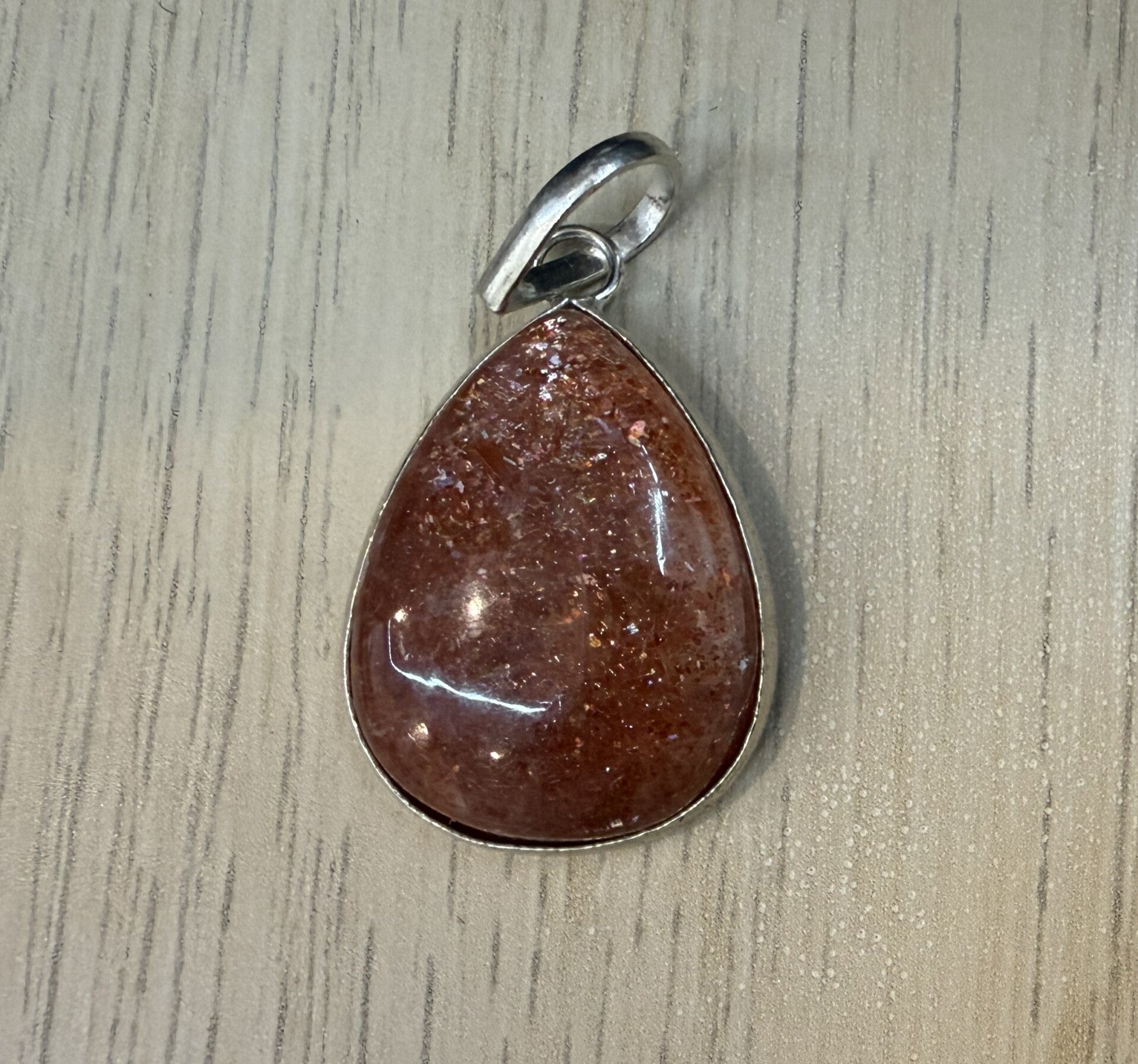 Ce Pendentif Pierre de Soleil est une création lumineuse et chaleureuse, mettant en valeur une pierre naturelle aux reflets scintillants uniques.